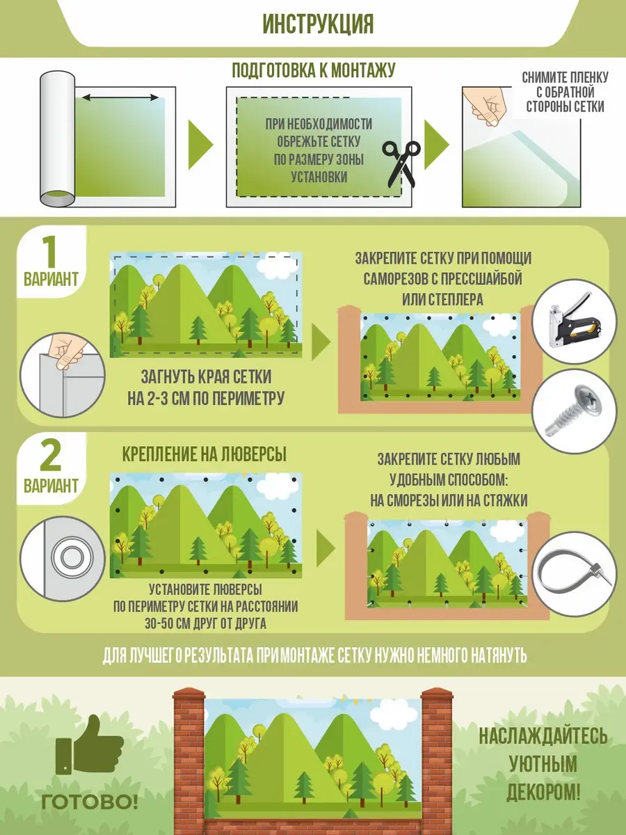 - Размер полотна 1,5х1,5 метра — оптимальный для декорирования стандартных секций забора